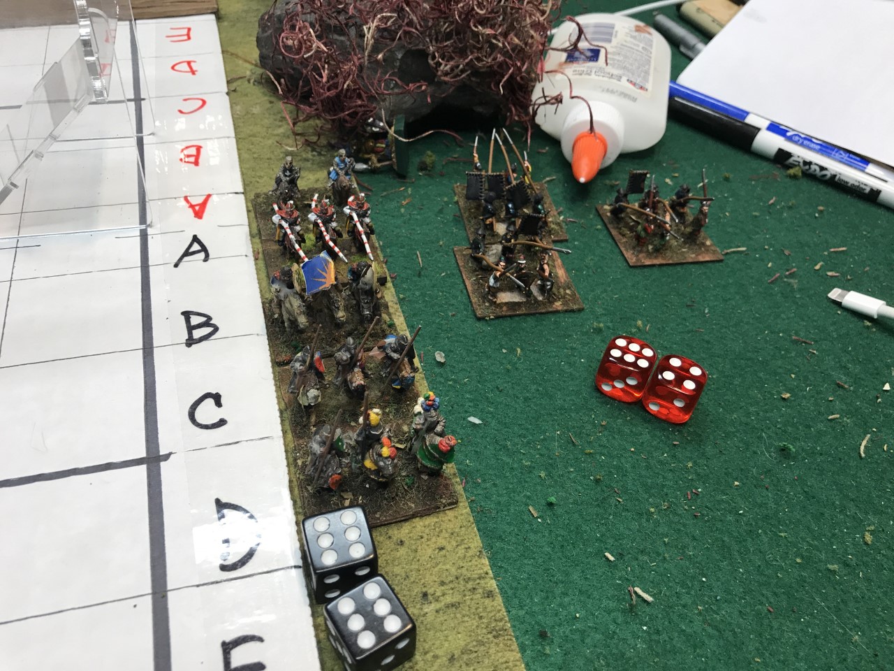 Dennis Shorthouse, Proprietor of On Military Matters book service., has organized an impromptu tournament using a battle grid system of his devising. All figures are place on a grid so players can play over a telephone without a video component.