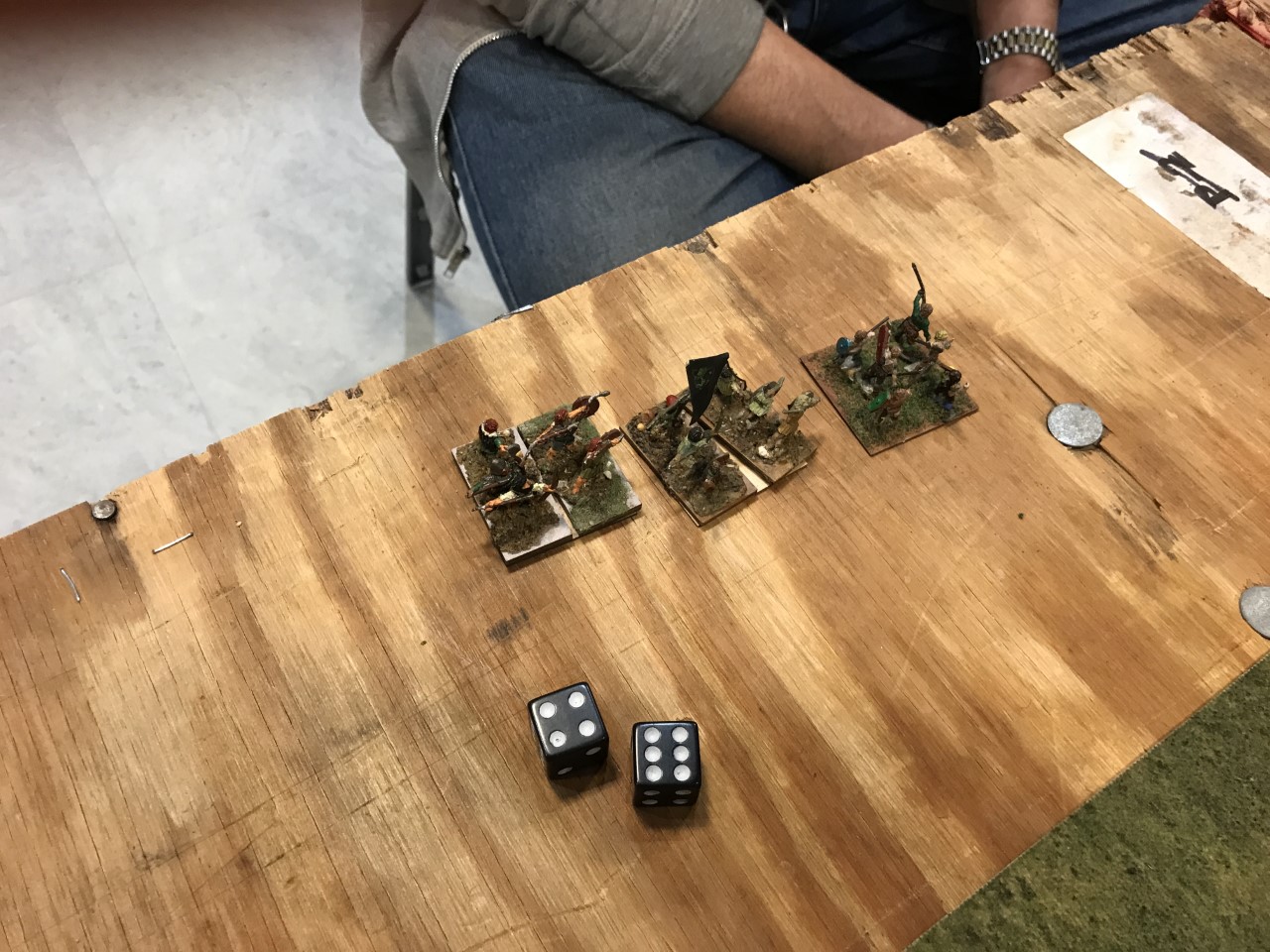Heavily disorder, but with no where else to go, the elephant command charges. And the dice favored them, 2-1. |