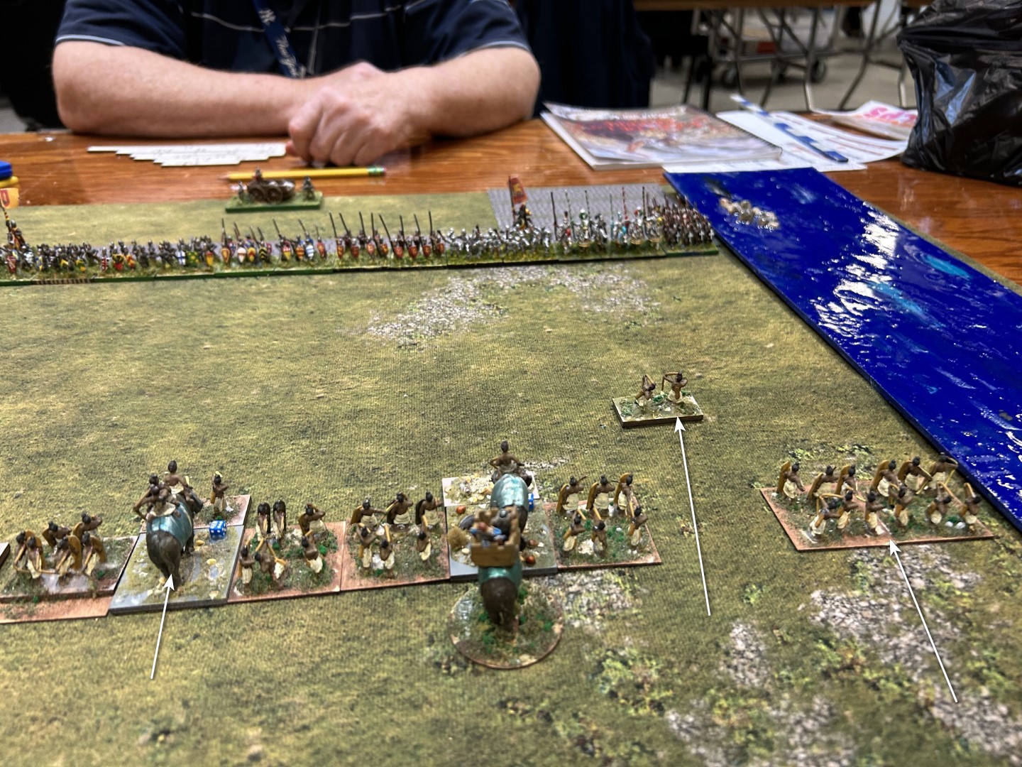 | Shitake orders a charge of 3 of his units. One is destroyed on contact, but the elephants win through. |