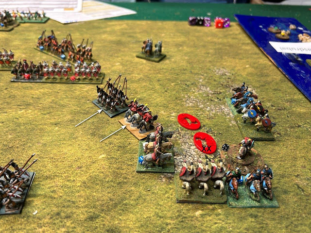 | One Numidian light horse (blue die) has leaked through the lines. Two Triarii turn to challenge it. |