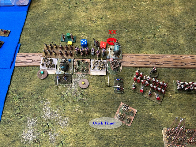 The attempt to use the medium horse to get around the flanks of the Roman line was a mistake. It's commander was only ordinary, so that horse was out of command reach requiring 2 CP's to do anything. So the Triarii assigned to cover it managed to run it down. Only a good roll for CP's allowed the horse to "exit a ZOC", vice being "run off the board." All in all, once the Triarii was turned or even separated from the main body, the horse should have been recalled.